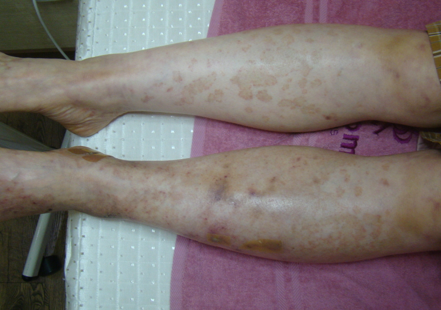 <피부에 얼룩덜룩한 색소반과 통증, 궤양이 청피반성혈관장애의 특징입니다.>