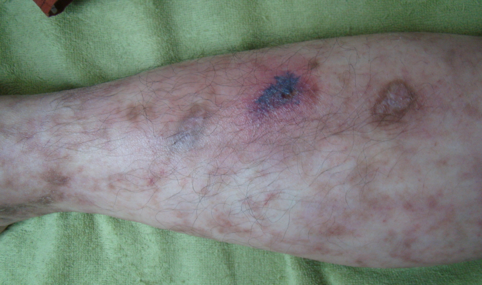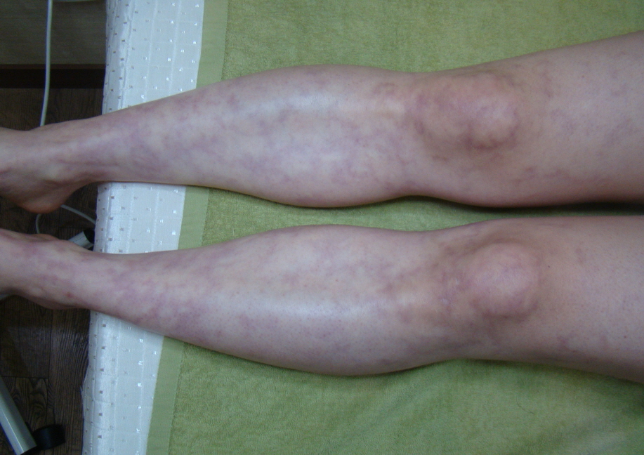 망상청피반은 발병 초기에는 사지, 그 중에서도 하지에 주로 발생을 합니다. 발목 관절이나 무릎 주변과 같은 피부가 얇아서 혈관이 노출되기 쉬운 부위에 호발합니다.
