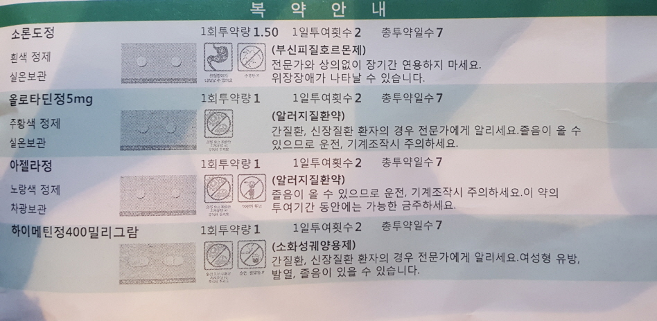 경우에 따라서는 마지막 처방전에 있는 데스오웬 로션과 같은 스테로이드 외용제를 처방 받기도 합니다. 그리고 하루에 2~3번 두드러기가 안 올라오더라도, 꼬박꼬박 약물을 복용하라고 교육받으십니다.