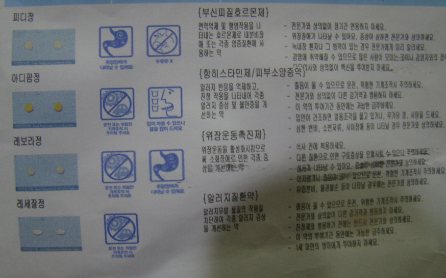 그리고 소론도, 피디정, 메치론처럼 부신피질호르몬제라고 명시된 약물들이 바로 스테로이드입니다. 반복적인 두드러기 환자분들은 이처럼 스테로이드와 항히스타민제가 섞인 약물을 처방 받으십니다.