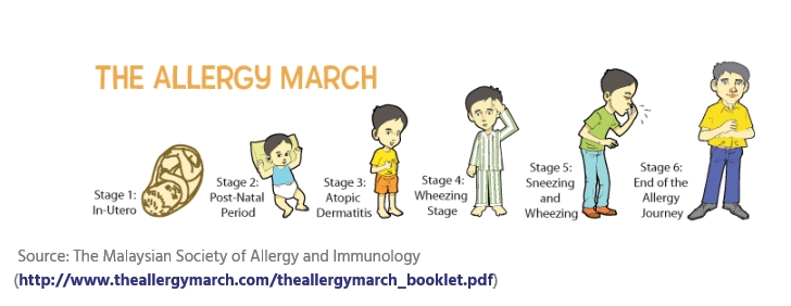 <알레르기 행진- 아토피피부염, 비염, 천식, 두드러기는 모두 연관된 알레르기 질환입니다.>
