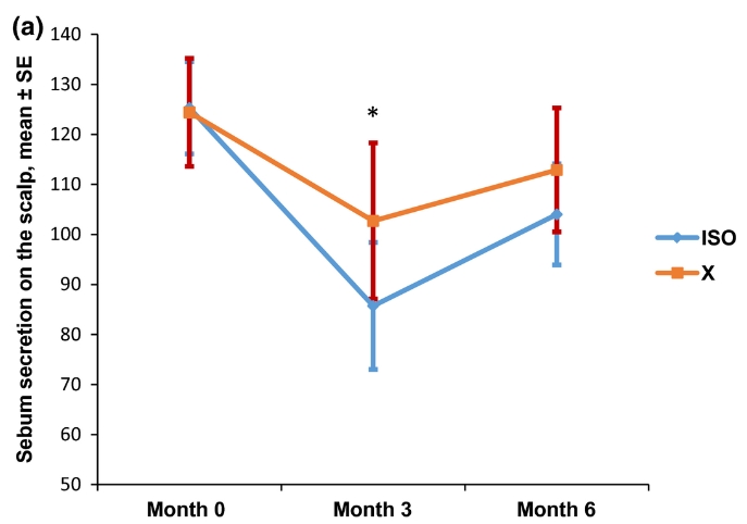 <두피의 피지분비가 이소트레티노인을 복용한 환자(ISO)들이 그렇지 않은 대조군(X)에 비해 줄었다는 결과>