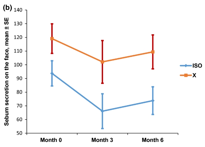 <얼굴의 피지분비가 이소트레티노인을 복용한 환자(ISO)들이 그렇지 않은 대조군(X)에 비해 줄었다는 결과>