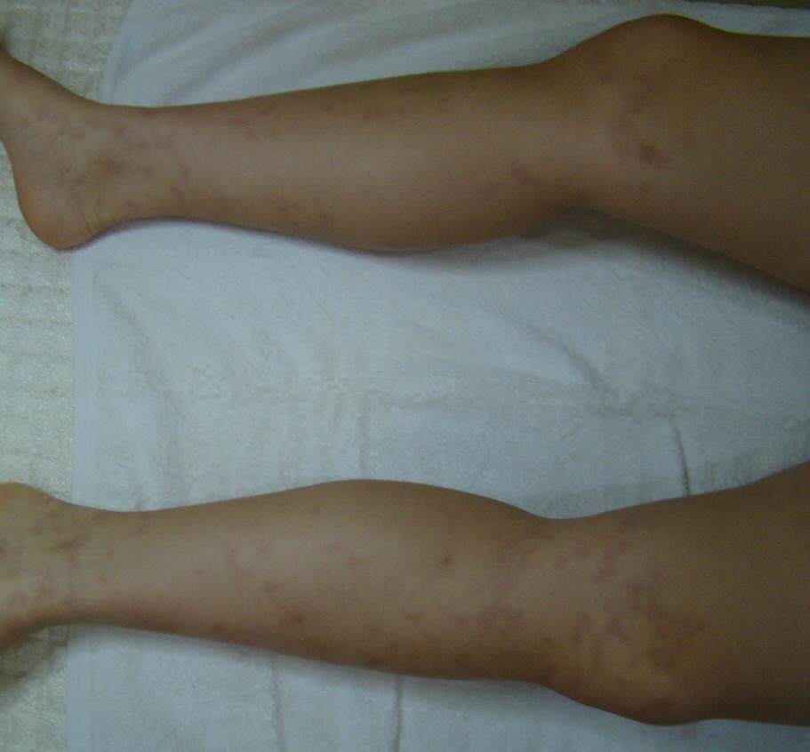 피부에 붉은색, 혹은 청자색의 얼룩덜룩한 그물 모양의 색깔 변화가 일어나는 질환을 ‘망상청피반’이라고 합니다. 우리말로는 ‘그물모양울혈반’이라고 합니다.