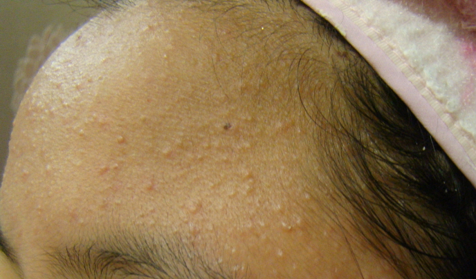 여드름의 형태, 첫 번째는 면포입니다. 면포는 여드름의 가장 초기 단계로, 각질과 피지가 합쳐진 것들이 모낭을 막고 있는 형태입니다. 보통 이 형태를 좁쌀여드름이라고 합니다. 좁쌀처럼 1mm 이하로 자잘하게 생기는 여드름을 말합니다.
