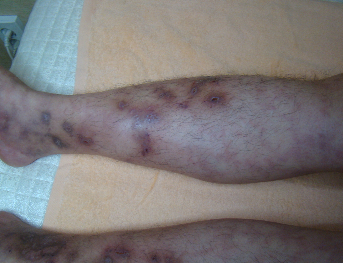 혈전으로 인해 하지의 혈류순환장애가 유발되면 얼룩덜룩한 피부색의 변화, 피부의 괴사, 하지의 궤양 등이 나타납니다.