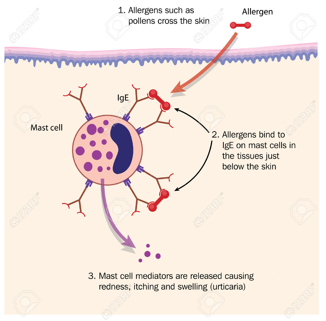 두드러기 반응을 일으키는 가장 기본적인 기전은 항원과 결합한 면역글로불린 E 항체가 비만세포의 수용체에 결합하여 히스타민 등의 화학매개물을 방출시키고 그로 인해 두드러기 반응이 일어난다는 것입니다.