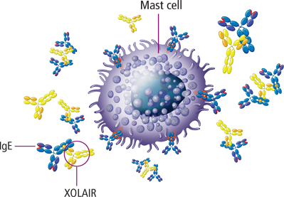 그리고 최근에 대두되고 있는 졸레어는 항원이 IgE에 결합해서 비만세포에 결합하기 이전에 먼저 IgE, 면역글로불린 E에 대신 결합하여 비만세포에 면역글로불린 E 항체가 결합하지 못하도록 해주는 약물입니다.