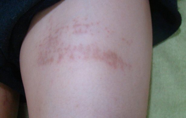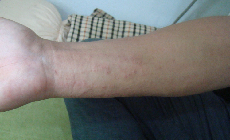<스타킹 압박부위에 발생한 접촉성 피부염>