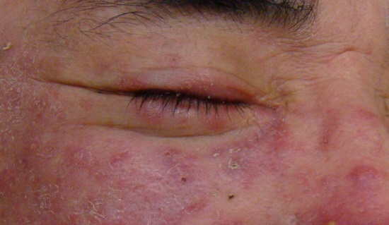 <좌- 결막염, 안검염이 동반된 주사 / 우- 코를 중심으로 얼굴 중앙부위가 붉어지는 것이 주사의 특징>
