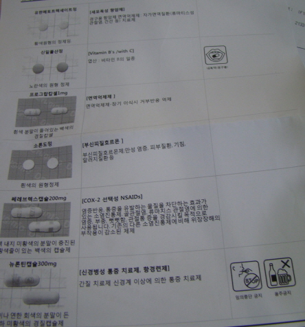 그밖에도 쎄레브렉스나 뉴론틴이 처방되어 있습니다. 이 약재들은 해열소염진통제로서 혈관염의 통증 제어와 신경병증성 통증 완화를 위해 처방됩니다.