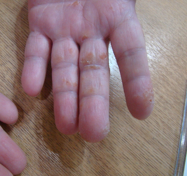 손바닥이나 손가락의 측면에서 자잘한 수포들로 시작이 되며, 수포와 함께 가려움이나 따가움이 동반됩니다. 심해지면 표피가 벗겨지면서 상처가 생기기도 합니다.