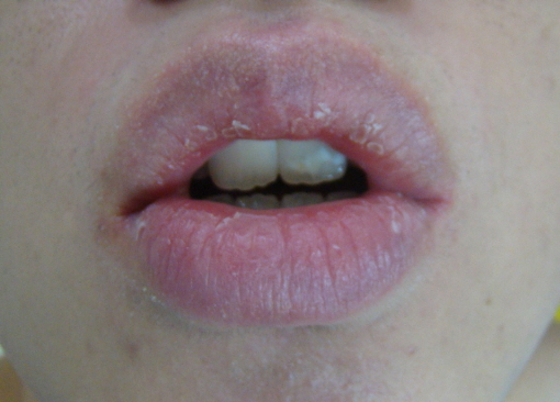 <입술에 건조함, 갈라짐. 화끈 거림, 가려운 증상이 나타나는 구순염>