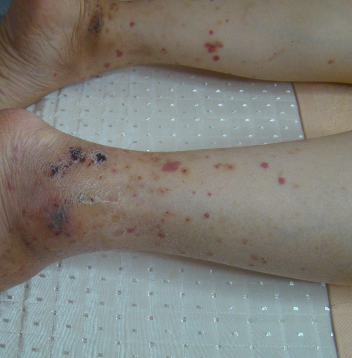 <피하 출혈과 피부의 상처가 동반된 자반증>