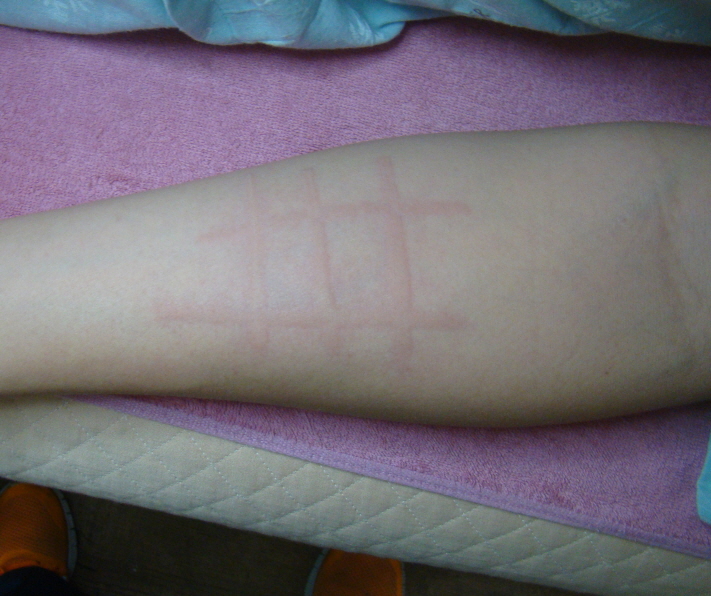 이때 간지러워 긁게 되면 두드러기가 더 올라오면서 더욱 간지럽게 되는데, 이것이 피부묘기증의 전형적인 패턴입니다.