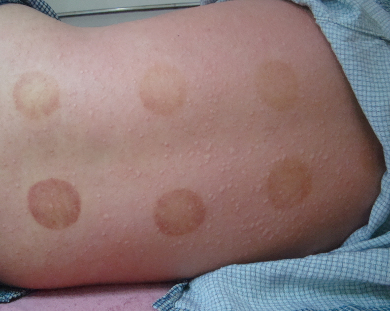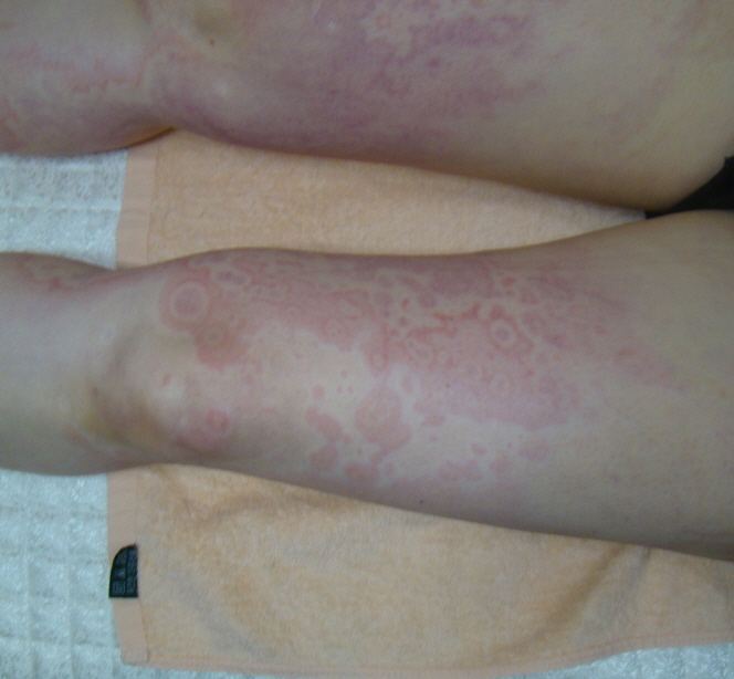 그밖에도 두드러기 형태 중 ‘원심고리홍반’이라는 것이 있습니다. 홍반이 생기되 피부가 크게 융기되지는 않고, 원 가운데 색은 정상 피부색에 가까운 모양으로 나타납니다.