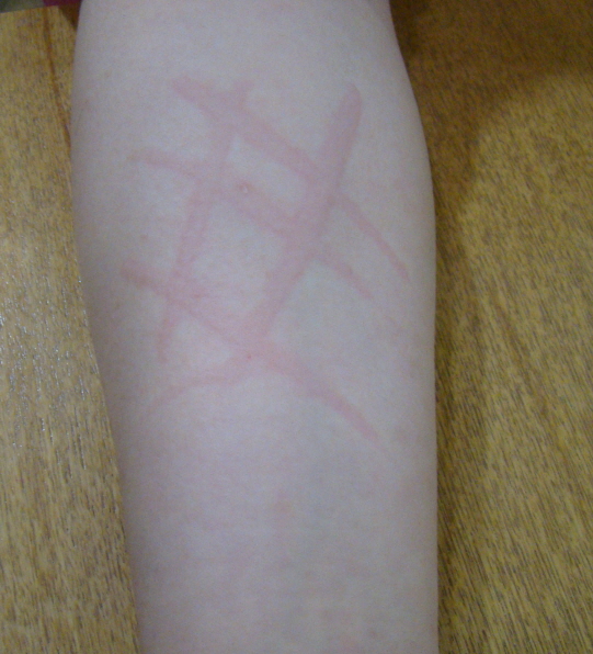 세 번째는 피부가 긁거나 마찰이 가해진 부위에 선상으로 부풀어 오르는 두드러기입니다. 주로 피부묘기증 환자에 해당하는 두드러기입니다.