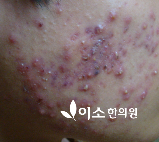 처음에는 결절이 단단하다가 점차 화농이 동반되기도 하고, 딱지가 생기기도 합니다. 또 여러 개의 여드름이 합쳐지면서 병변 부위가 더 커지기도 합니다.