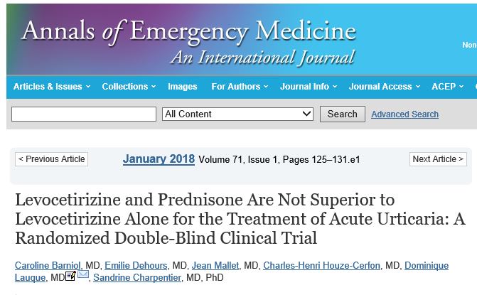 레보세티리진(levocetirizine), 즉 항히스타민제와 프레드니솔론(prednisolone), 스테로이드를 병행 투여한 환자들과 항히스타민제만 처방한 환자들의 두드러기 증상이 완화되는 결과에 대해 연구한 논문입니다.