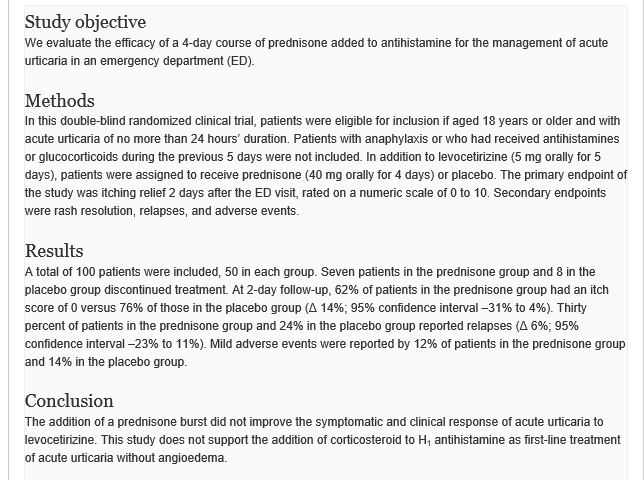 오늘은 두드러기 치료에 과연 스테로이드 복용이 필요한 것인가에 대해 연구한 논문이 있어서 소개해볼까 합니다.
