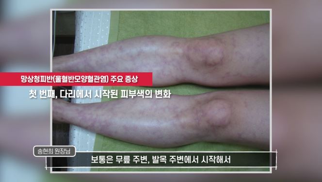 추운 곳에서 다리에 얼룩덜룩 피부색 변화가 있다, 손발이 차다, 종아리도 아프고 땡땡하게 붓는다. 이런 증상들이 동반된다면 망상청피반, 울혈반모양혈관염일 수 있습니다.