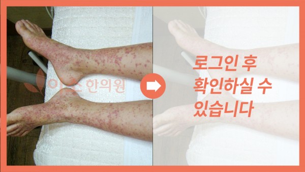 30대 여성 색소성자반증, 치료 전, 치료 2개월 후 종료. 30대 색소성자반증 환자분으로 가족 중에 만성적인 자반증으로 신장 이식한 가족력이 있어서 혹시라도 만성화 되지 않을까 염려를 많이 하셨던 여성 환자분이었습니다. 대학병원에서 스테로이드 며칠 복용 하면 옅어지는 듯 하다가 복용 중단하면 다시 자반 개수가 증가하니 대학병원에서도 그냥 지켜 보면서 경과 보자고 해서 치료법이 없는 건지 많이 걱정하셨고 […]
