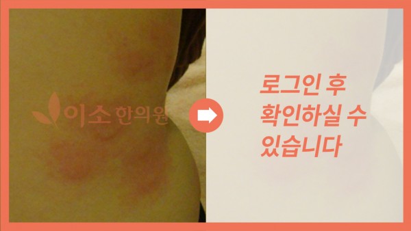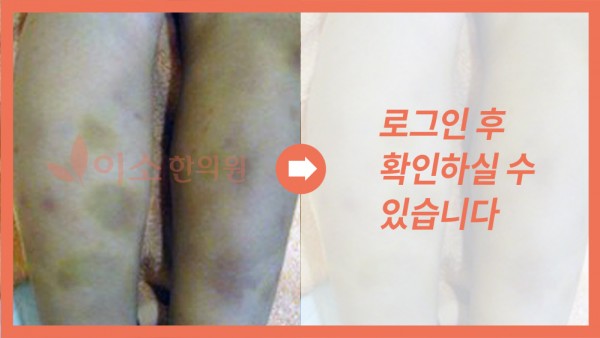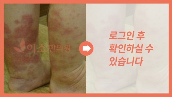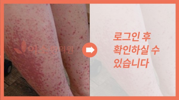 처음에는 붉은 두드러기처럼 올라오기 시작해서 내과와 피부과에 다녔고, 장염 증상이 와서 급기야 입원하고 2~3일 정도 지나 가라 앉았는 듯 했는데 퇴원 후에 이튿날 다시 붉은 증상이 생겼다고 하심. 한의원에 내원하여 다리 종아리가 아프고 복통을 호소하셨고 알레르기성 자반증으로 진단, 체질검사에 따른 한약처방과 꾸준한 침치료를 통해 2개월여 만에 회복 되었음.
