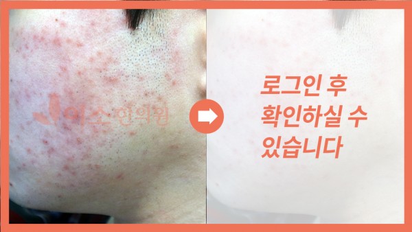 항생제 복용, 스테로이드 연고를 사용 했지만 호전되지 않고 점점 악화되었던 20대 남성 주사피부염 치료 사례 입니다. 치료 전 치료 후