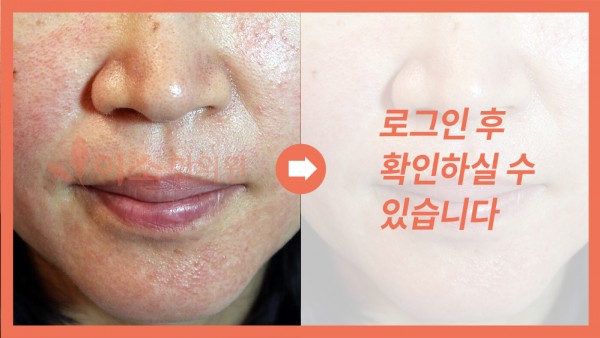 수 년간 지속되던 50대 여성 주사피부염 치료 전후 입니다. 50대 여성들의 안면홍조는 단순 갱년기 증후군이 아닐 수 있습니다. 특히 홍조, 상열감과 함께 뾰루지, 가려움, 따가움 등이 있다면 정확한 감별이 필요 합니다. 치료 전 치료 후
