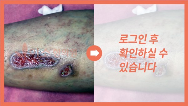 피부의 몽우리, 붉은 반점 등이 수년간 반복되면서 피부 궤양으로 발전한 혈관염 환자 치료 사례입니다. 혈관의 이상으로 인한 피부 괴사, 궤양은 혈관의 이상 상태가 개선되어야 재생 될 수있습니다.